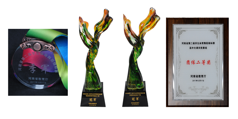 赵一帆、王倩倩在普通高校B组和普通高职高专B组比赛中夺得冠军,蒋存科、赵大为夺得高中单人B组第二名和第三名,范暄榕和孙梦萍在高中省队D组荣获第三名。代表队荣获高中大课间竞赛组团体二等奖。