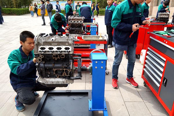 同样,汽车系16级汽车检测与维修班的同学在技能文化节期间也收获颇丰,各式的拆装工具交替在他们手中飞旋,汽车零件被快速流畅拆分。短短20分钟,一台EA888发动机的所有的零件展现在大家面前,而后又重新恢复原貌。大方的仪态,得体的举止,成为汽车系15级汽车营销专业入校后学习的内容。微笑、接待、讲解、应变,每一个行动都体现了汽车营销礼仪课程的优雅与智慧并存的迷人魅力和职业风采。