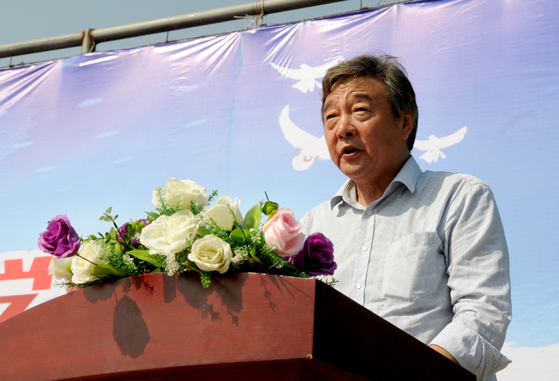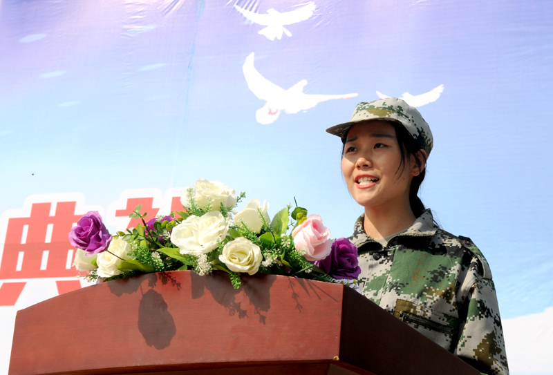 新生代表师范学院王颖同学发言,她说,我们全体新生一定要将军训期间展现出来的坚强的毅力、良好的生活习惯继续保持下去,牢记校训,争做德智体美全面发展的优秀大学生。