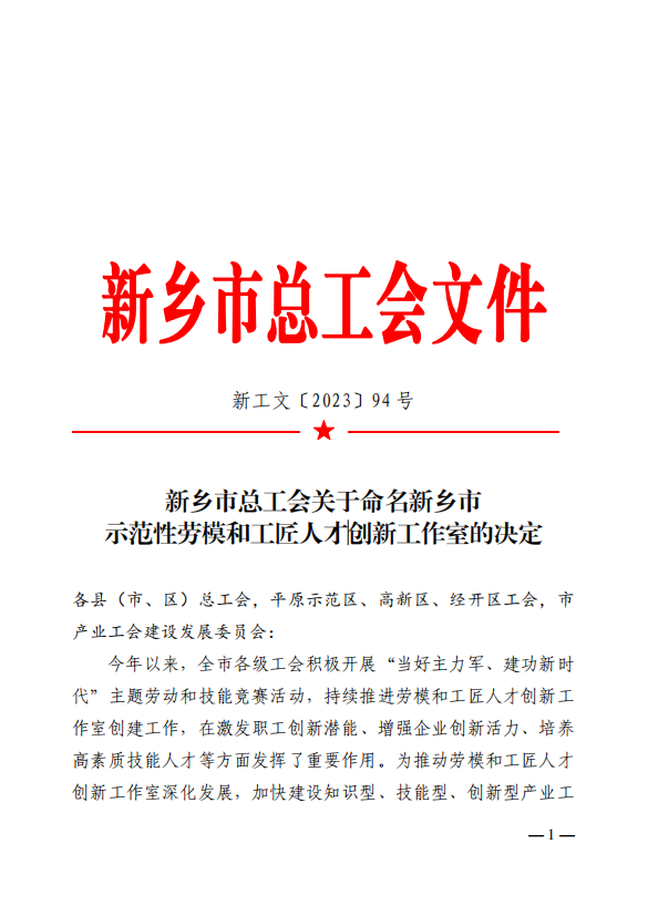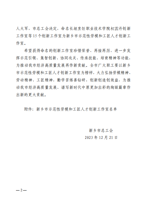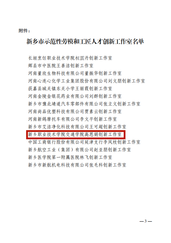 近日,新乡市总工会发布《新乡市总工会关于命名新乡市示范性劳模和工匠人才创新工作室的决定》(新工文〔2023〕94号),我校推荐报送的交通学院高恩娟创新工作室成功获评“新乡市示范性劳模和工匠人才创新工作室”。
