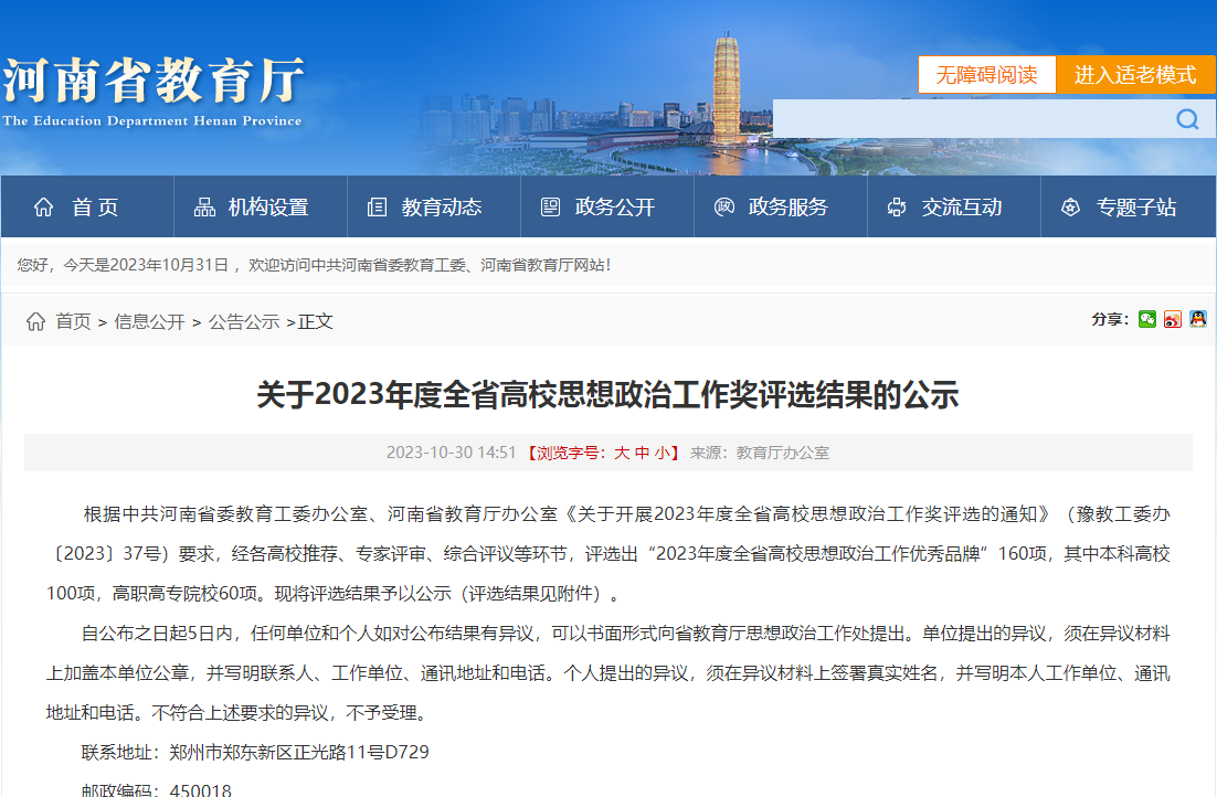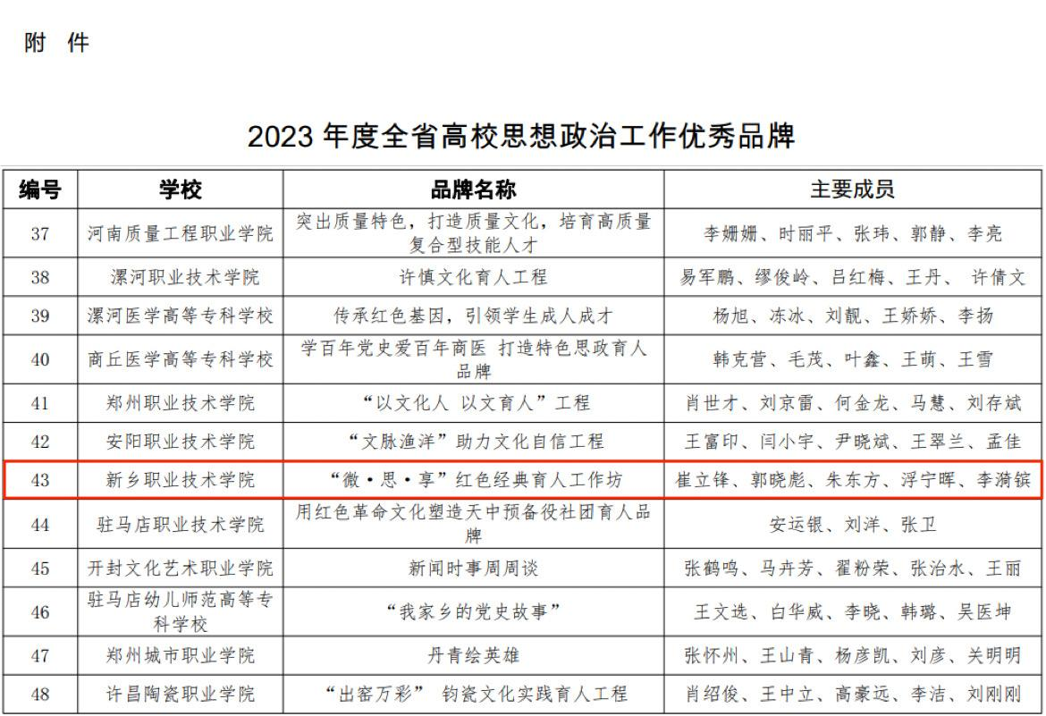 近日,在中共河南省委高校工委、河南省教育厅组织的2023年度全省高校思想政治工作优秀品牌的评选活动中,我校“‘微·思·享’红色经典育人工作坊”荣获全省高校思想政治工作优秀品牌,这是继2018年后我校第二次荣获全省高校思想政治工作优秀品牌,是对我校思政教育工作的高度肯定。
