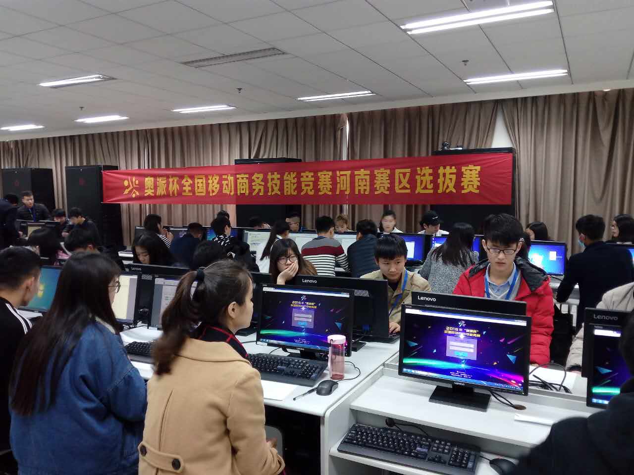 由全国电子商务职业教育指导委员会主办的第二届“奥派杯”全国移动商务技能竞赛——河南赛区选拔赛于11月12日河南省财政金融学院拉开帷幕。来自全省各院校的33支代表队参加了本次大赛,比赛分为高职组和中职组。我院电子系选派了一个高职队和三个中职队参加了本次选拔赛,经过激烈的角逐,最终斩获高职组一等奖1个、中职组一等奖1个、中职组二等奖1个、中职组三等奖1个,并代表河南赛区高、中职组双双参加全国总决赛。