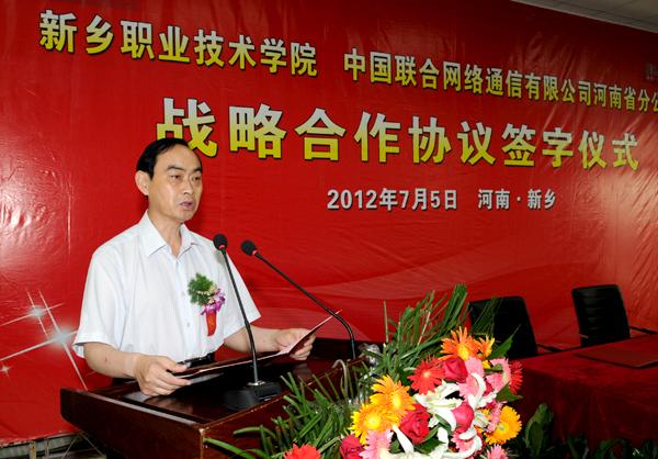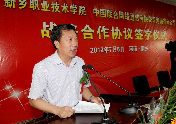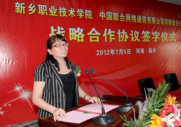 学院党委书记朱性福、中国联通河南分公司副总经理候金萍分别对此次合作发表讲话;王治通代表新乡市委、市政府对此次校企合作给予了充分的肯定及美好的祝愿。
