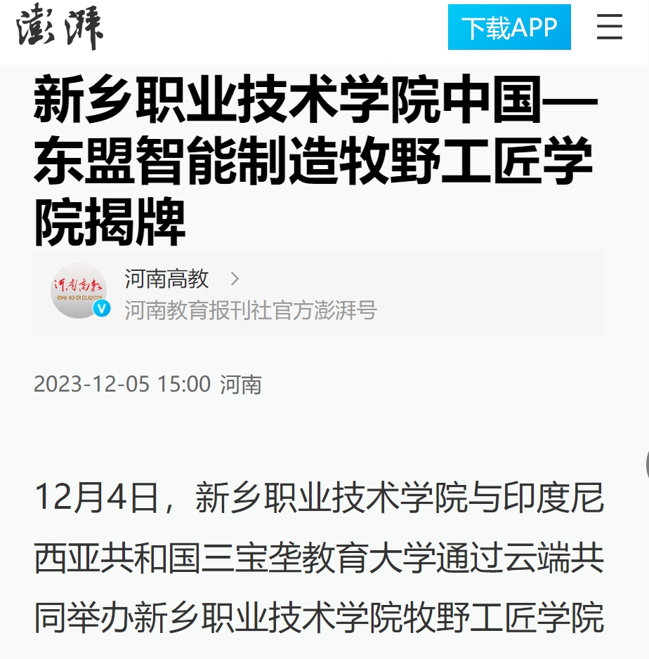 【澎湃新闻】新乡职业技术学院中国—东盟智能制造牧野工匠学院揭牌