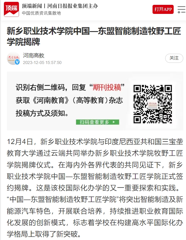 【顶端新闻】新乡职业技术学院中国—东盟智能制造牧野工匠学院揭牌