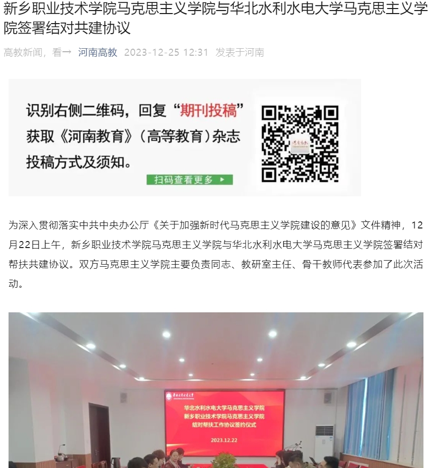 【河南高教】新乡职业技术学院马克思主义学院与华北水利水电大学马克思主义学院签署结对共建协议