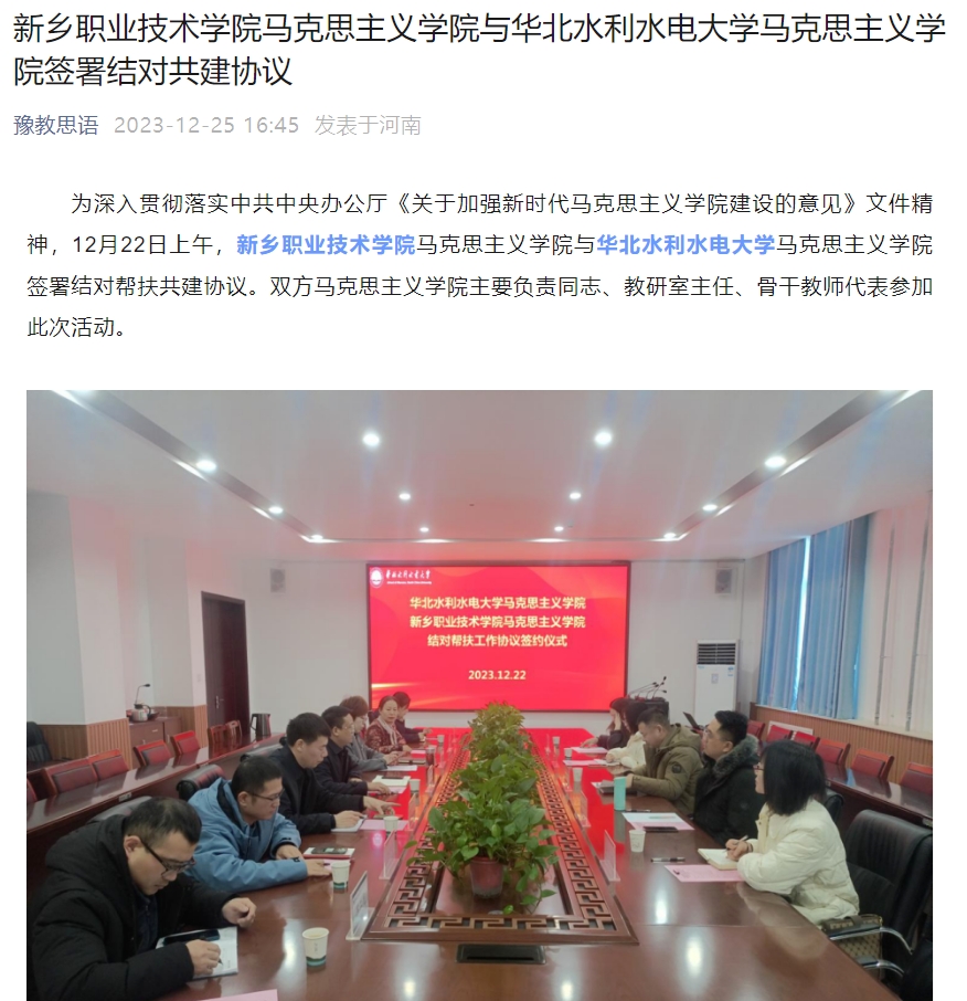 【豫教思语】新乡职业技术学院马克思主义学院与华北水利水电大学马克思主义学院签署结对共建协议