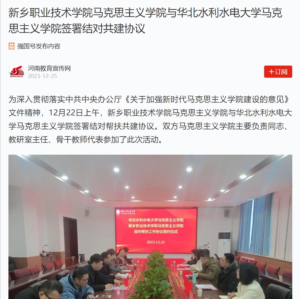 【学习强国】新乡职业技术学院马克思主义学院与华北水利水电大学马克思主义学院签署结对共建协议