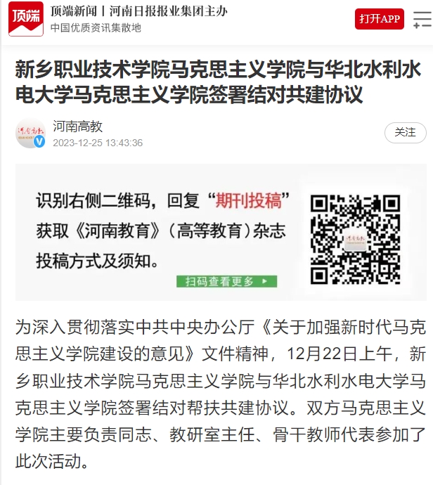 【顶端新闻】新乡职业技术学院马克思主义学院与华北水利水电大学马克思主义学院签署结对共建协议