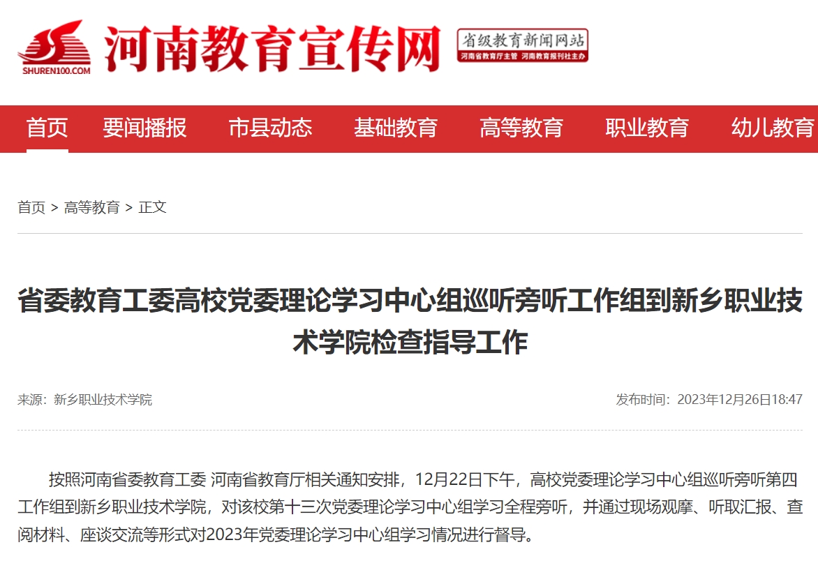 【河南教育宣传网】省委教育工委高校党委理论学习中心组巡听旁听工作组到新乡职业技术学院检查指导工作