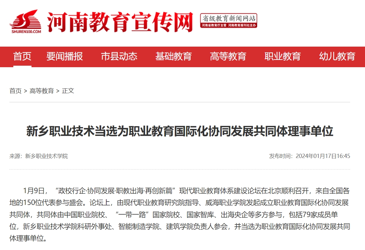 【河南教育宣传网】新乡职业技术当选为职业教育国际化协同发展共同体理事单位