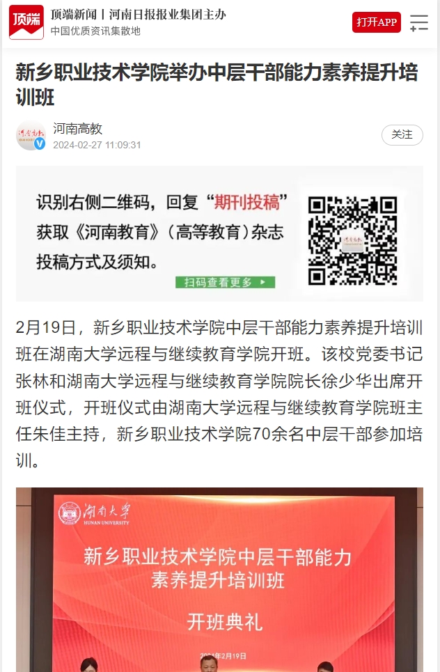 【顶端新闻】新乡职业技术学院举办中层干部能力素养提升培训班