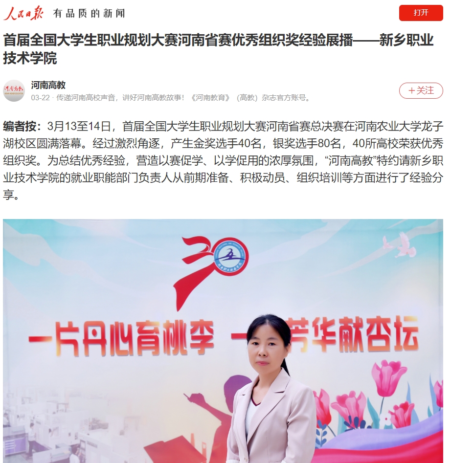 【人民日报】首届全国大学生职业规划大赛河南省赛优秀组织奖经验展播——新乡职业技术学院