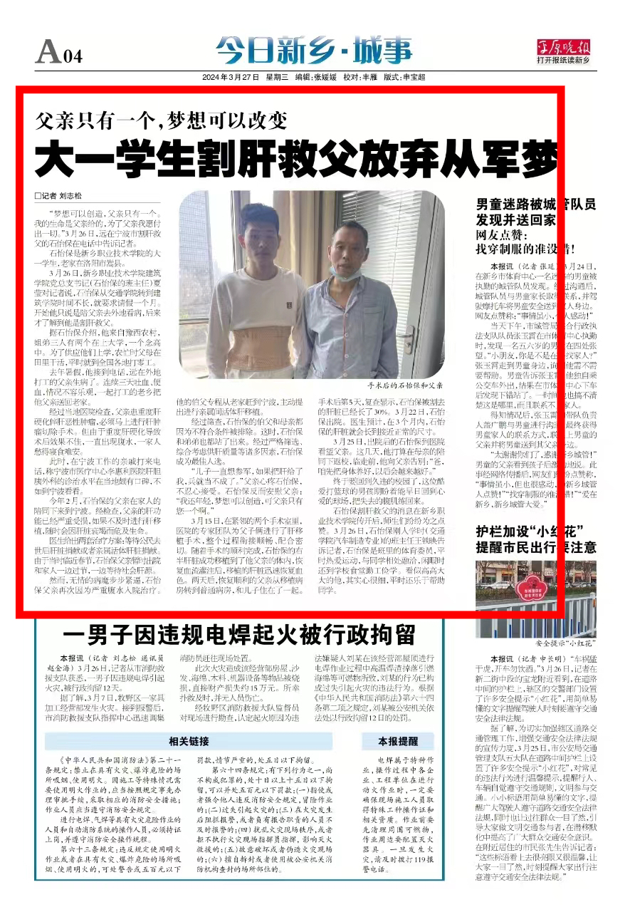 【平原晚报】大一学生割肝救父放弃从军梦