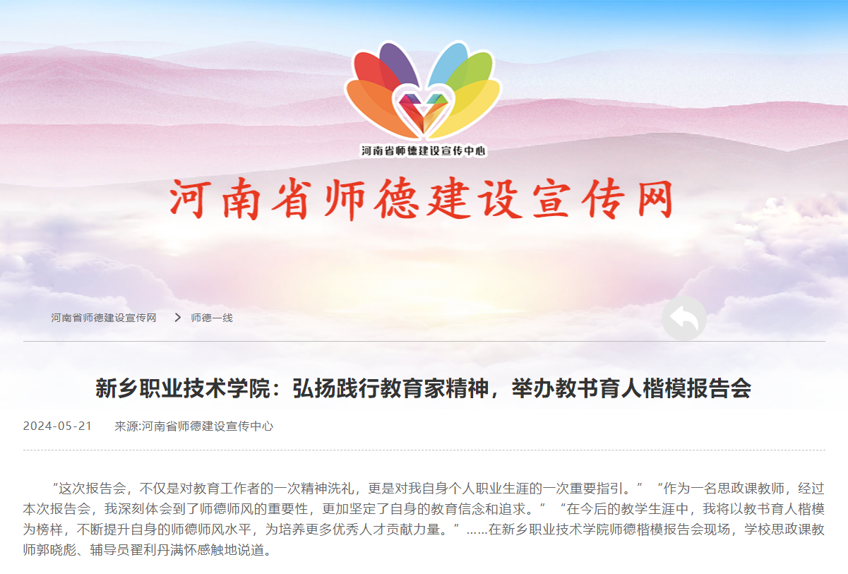 【河南省师德建设宣传网】新乡职业技术学院:弘扬践行教育家精神,举办教书育人楷模报告会