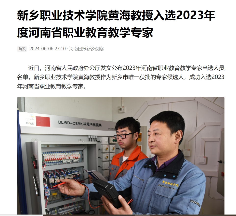 【今日头条】新乡职业技术学院黄海教授入选2023年度河南省职业教育教学专家