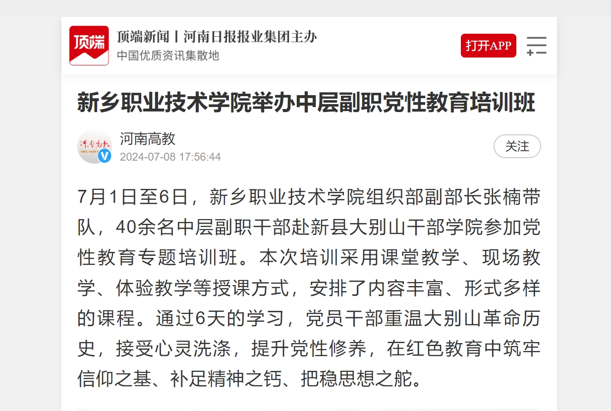 【顶端新闻】新乡职业技术学院举办中层副职党性教育培训班