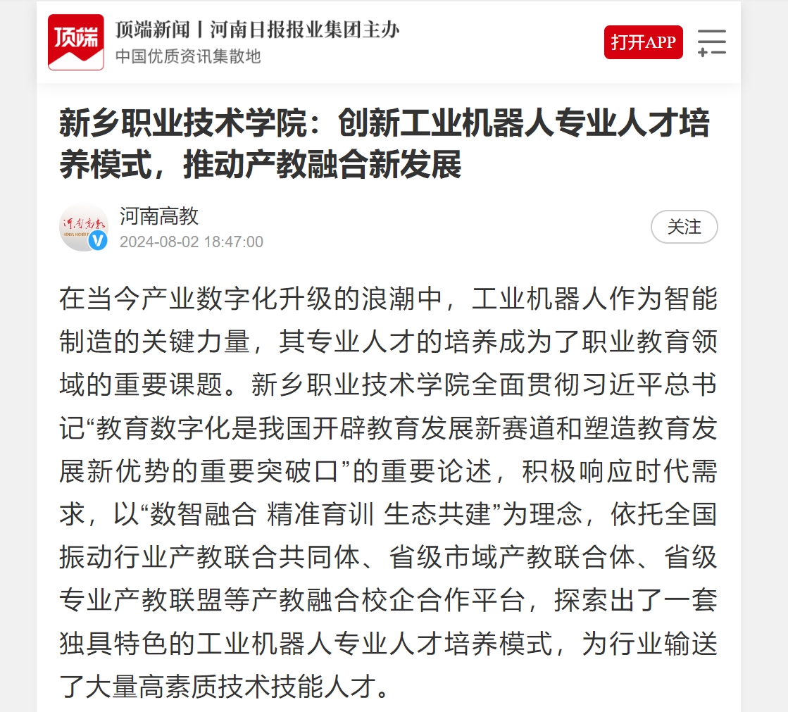 【顶端新闻】新乡职业技术学院:创新工业机器人专业人才培养模式,推动产教融合新发展