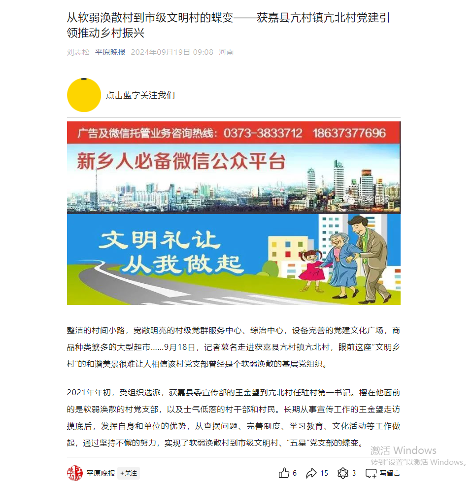 【平原晚报】从软弱涣散村到市级文明村的蝶变——获嘉县亢村镇亢北村党建引领推动乡村振兴