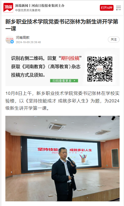 【顶端新闻】新乡职业技术学院党委书记张林为新生讲开学第一课