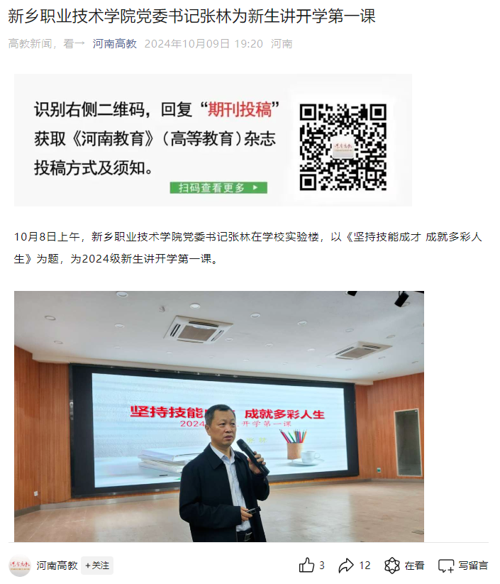 【河南高教】新乡职业技术学院党委书记张林为新生讲开学第一课