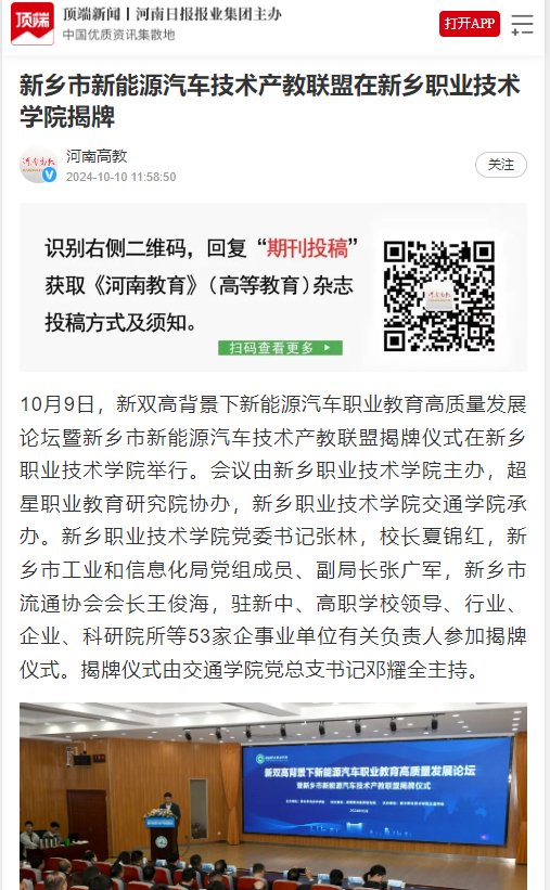【顶端新闻】新乡市新能源汽车技术产教联盟在新乡职业技术学院揭牌