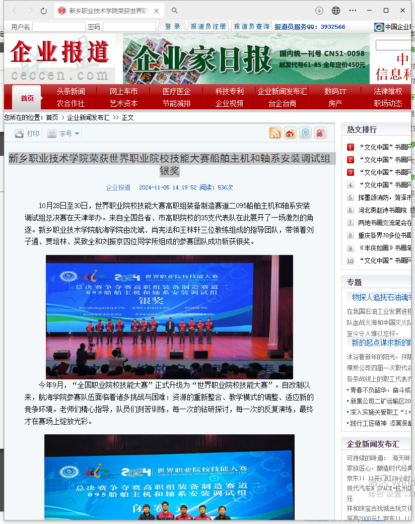 【中国企业报道】新乡职业技术学院荣获世界职业院校技能大赛船舶主机和轴系安装调试组银奖