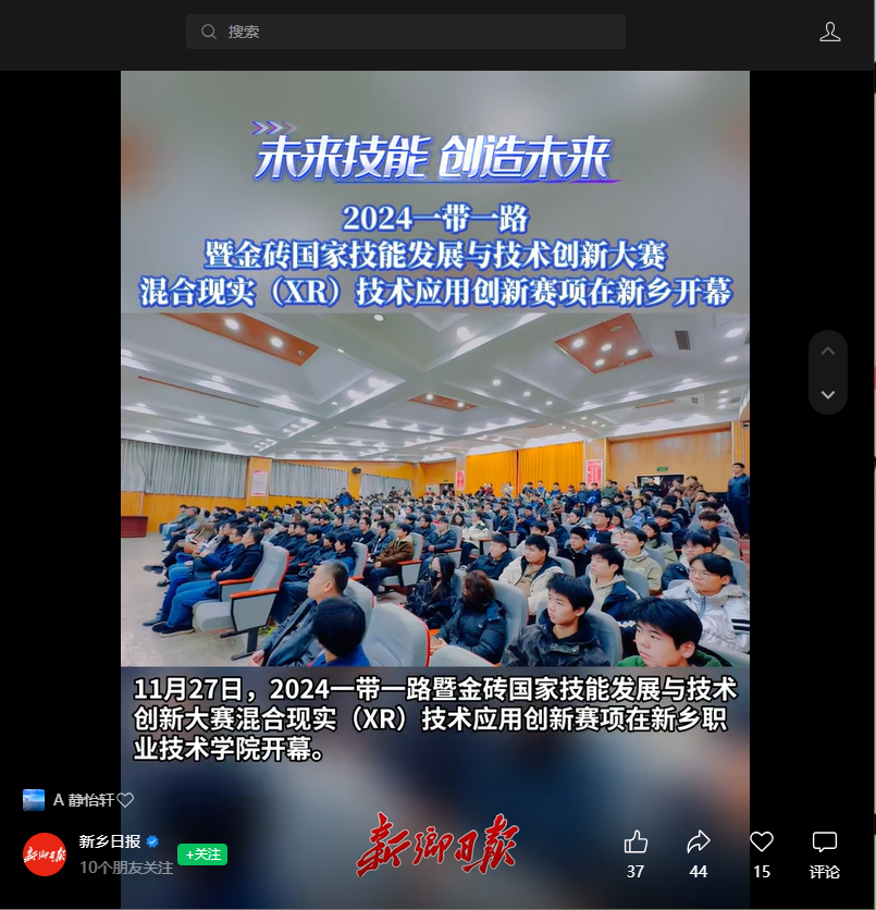 【新乡日报】11月27日,2024一带一路暨金砖国家技能发展与技术创新大赛混合现实(XR)技术应用创新赛项在新乡职业技术学院开幕。