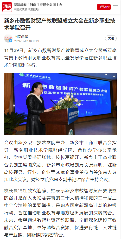 【顶端新闻】新乡市数智财贸产教联盟成立大会在新乡职业技术学院召开