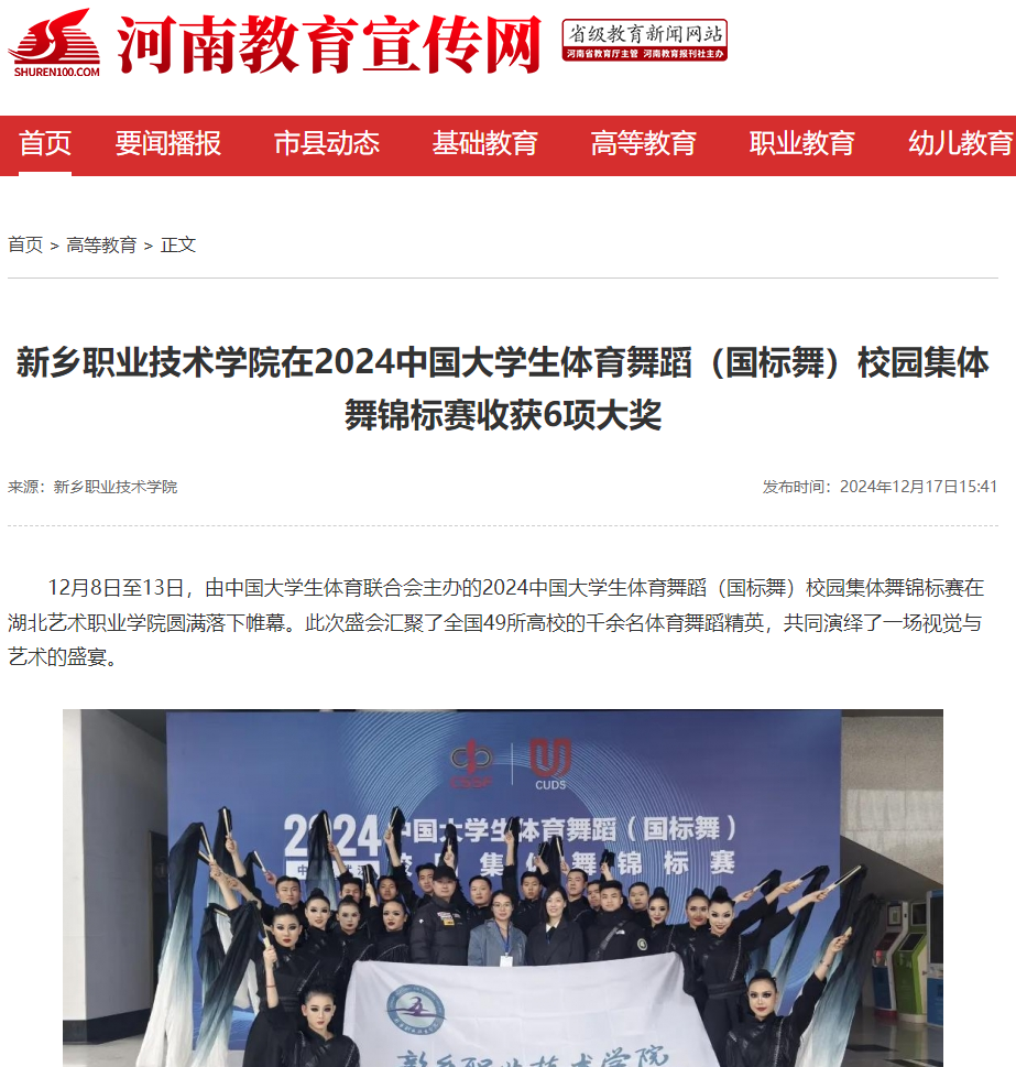 【河南教育宣传网】新乡职业技术学院在2024中国大学生体育舞蹈(国标舞)校园集体舞锦标赛收获6项大奖