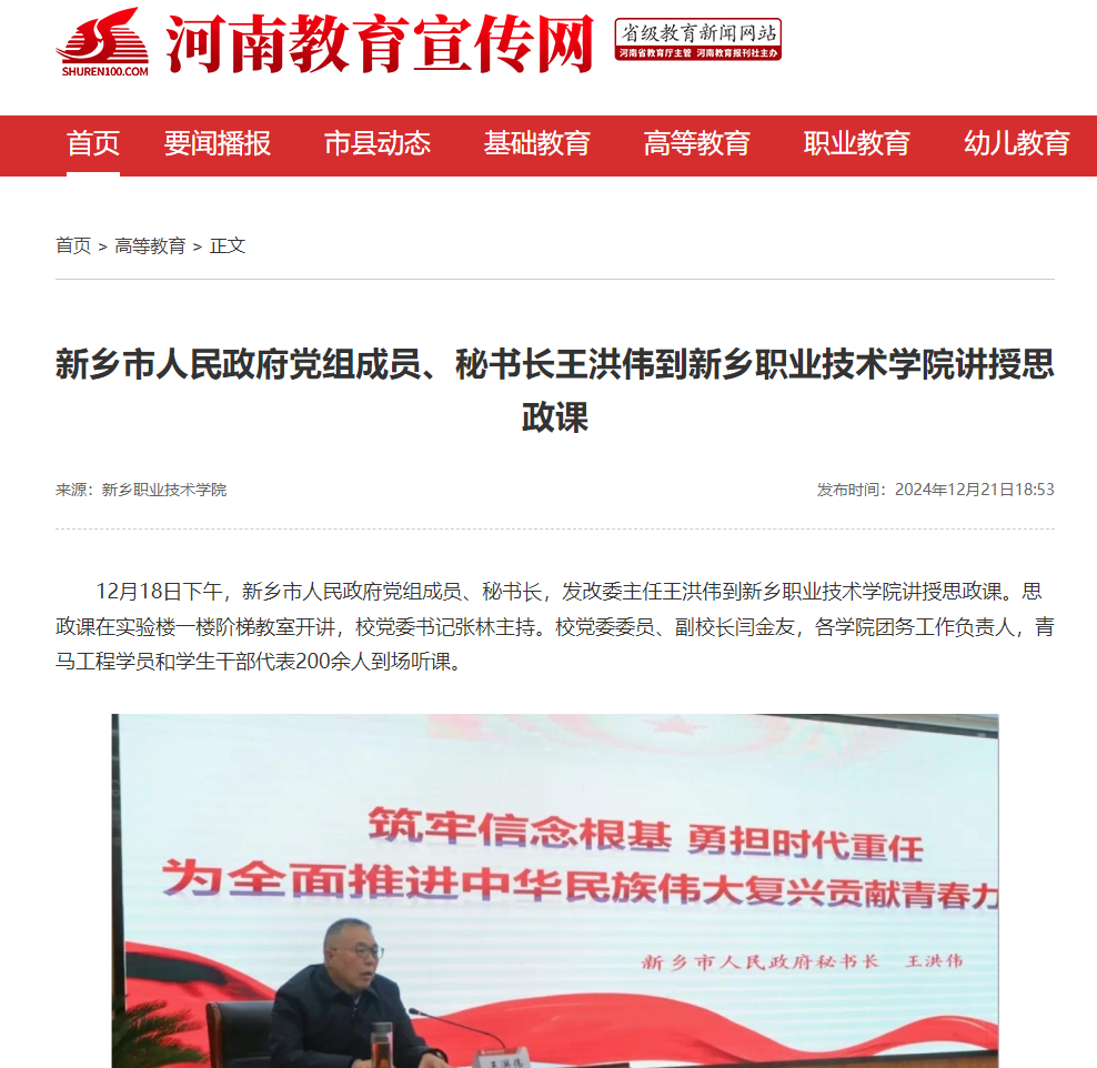 【河南教育宣传网】新乡市人民政府党组成员、秘书长王洪伟到新乡职业技术学院讲授思政课