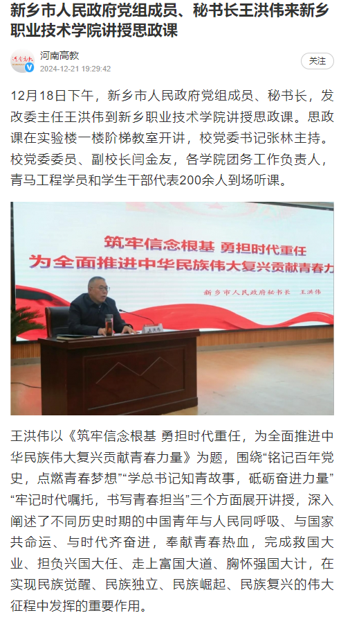 【河南高教】新乡市人民政府党组成员、秘书长王洪伟来新乡职业技术学院讲授思政课
