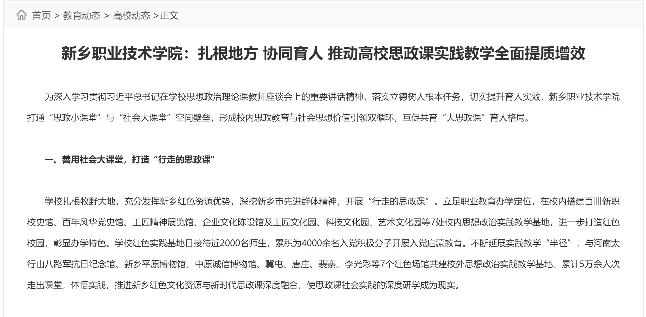 【河南省教育厅】新乡职业技术学院:扎根地方 协同育人 推动高校思政课实践教学全面提质增效
