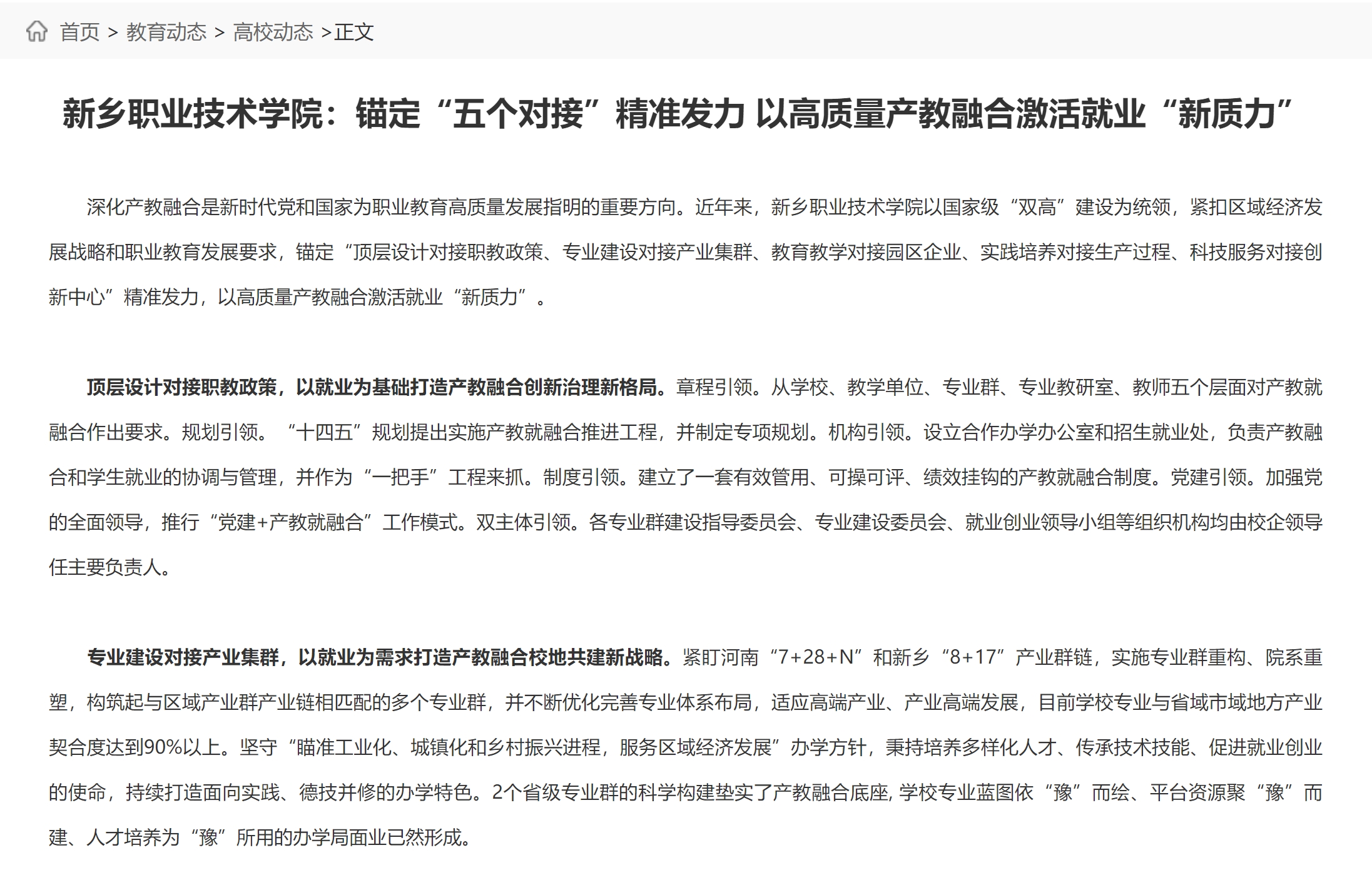 【河南省教育厅】新乡职业技术学院:锚定“五个对接”精准发力 以高质量产教融合激活就业“新质力”
