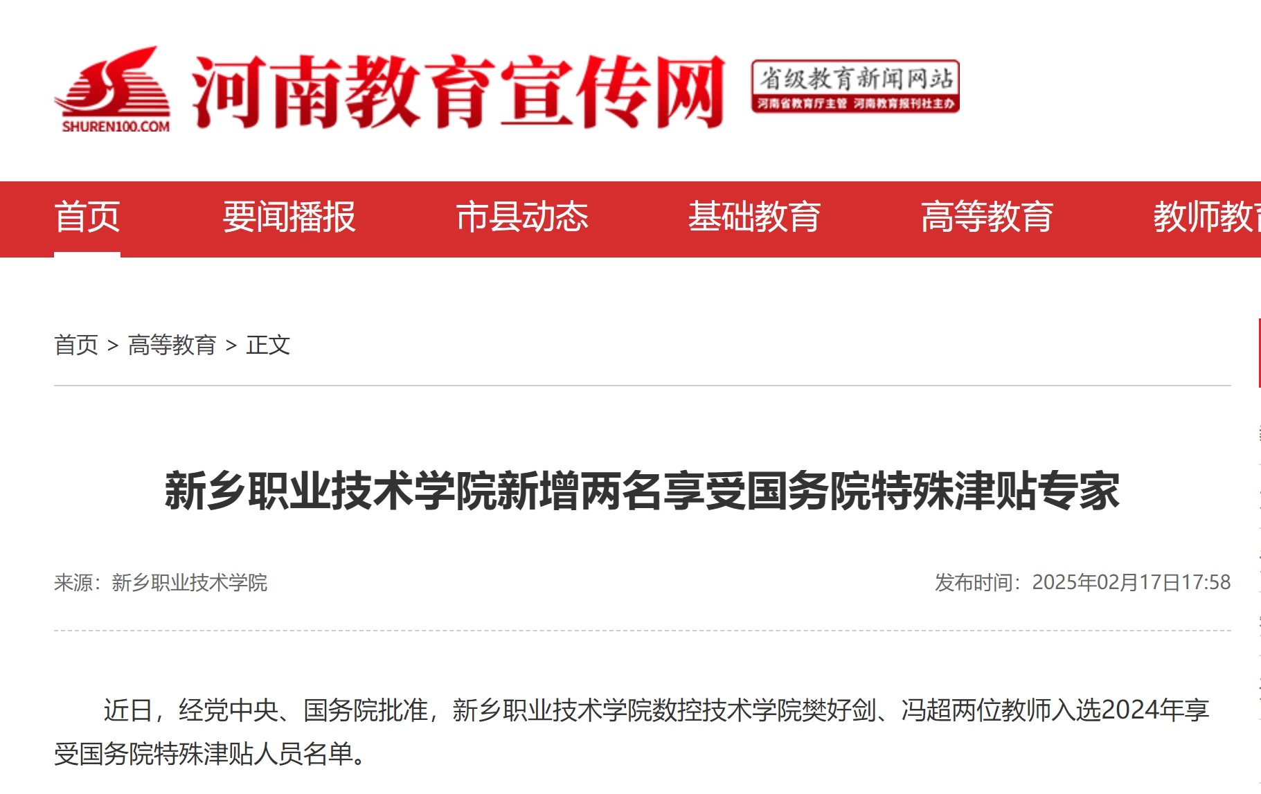 【河南教育宣传网】新乡职业技术学院新增两名享受国务院特殊津贴专家