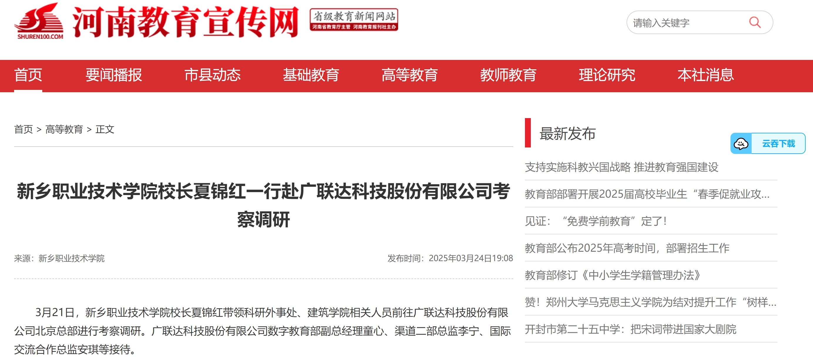 【河南教育宣传网】新乡职业技术学院校长夏锦红一行赴广联达科技股份有限公司考察调研