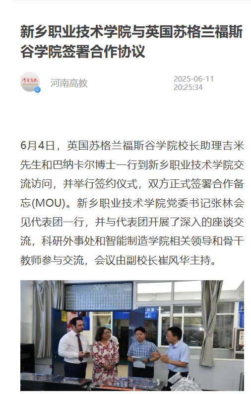 【大象新闻】新乡职业技术学院与英国苏格兰福斯谷学院签署合作协议