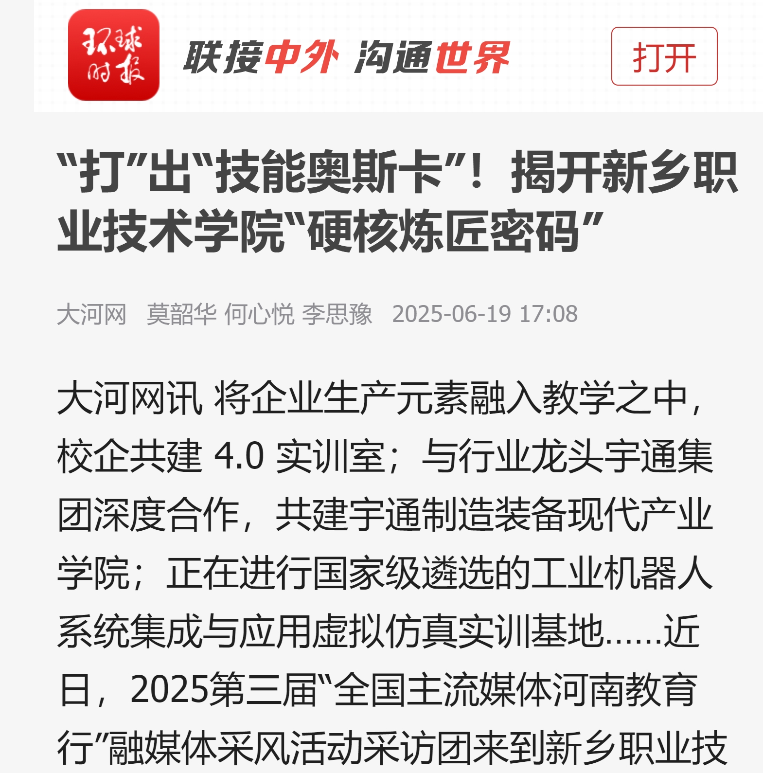 【环球时报】“打”出“技能奥斯卡”!揭开新乡职业技术学院“硬核炼匠密码”