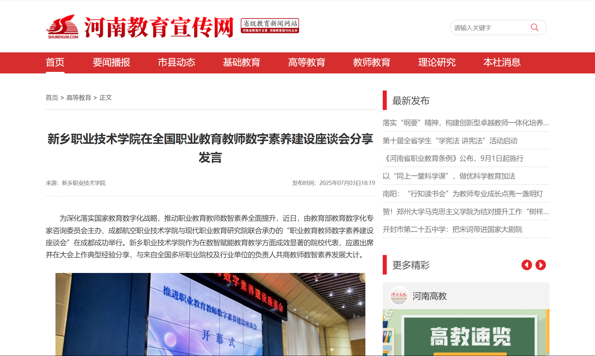 【河南教育宣传网】新乡职业技术学院在全国职业教育教师数字素养建设座谈会分享发言