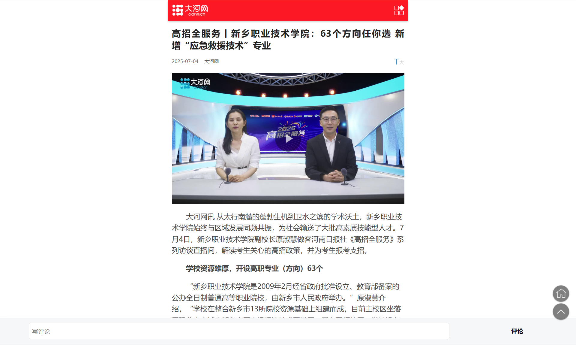 【大河网】高招全服务丨新乡职业技术学院:63个方向任你选 新增“应急救援技术”专业