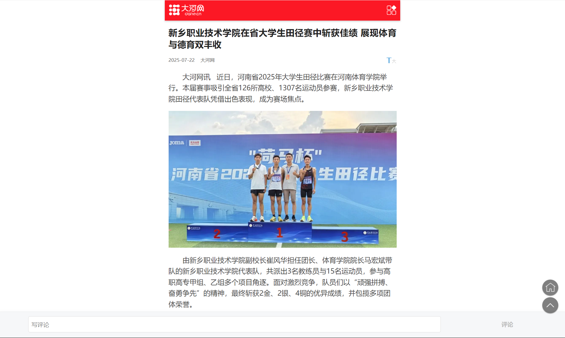 【大河网】新乡职业技术学院在省大学生田径赛中斩获佳绩 展现体育与德育双丰收