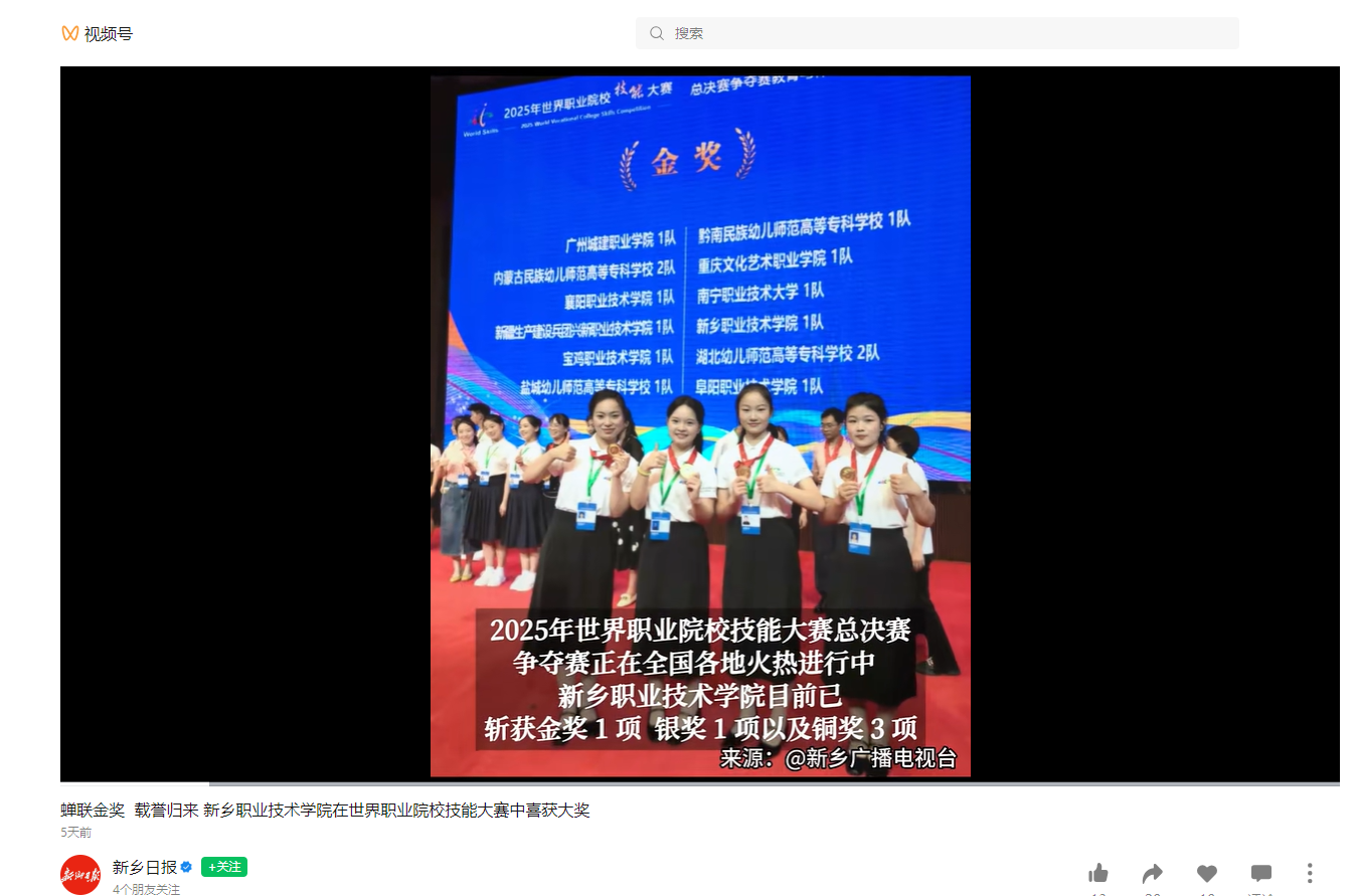 【新乡日报】蝉联金奖 载誉归来 新乡职业技术学院在世界职业院校技能大赛中喜获大奖