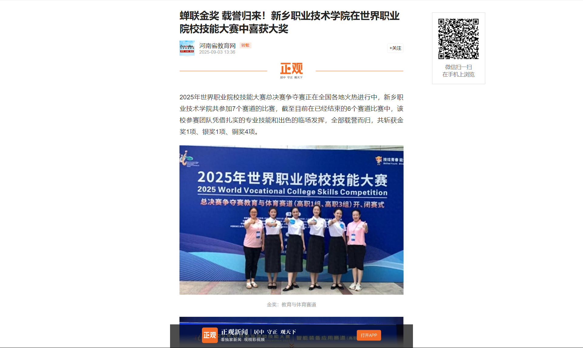 【正观新闻】蝉联金奖 载誉归来!新乡职业技术学院在世界职业院校技能大赛中喜获大奖