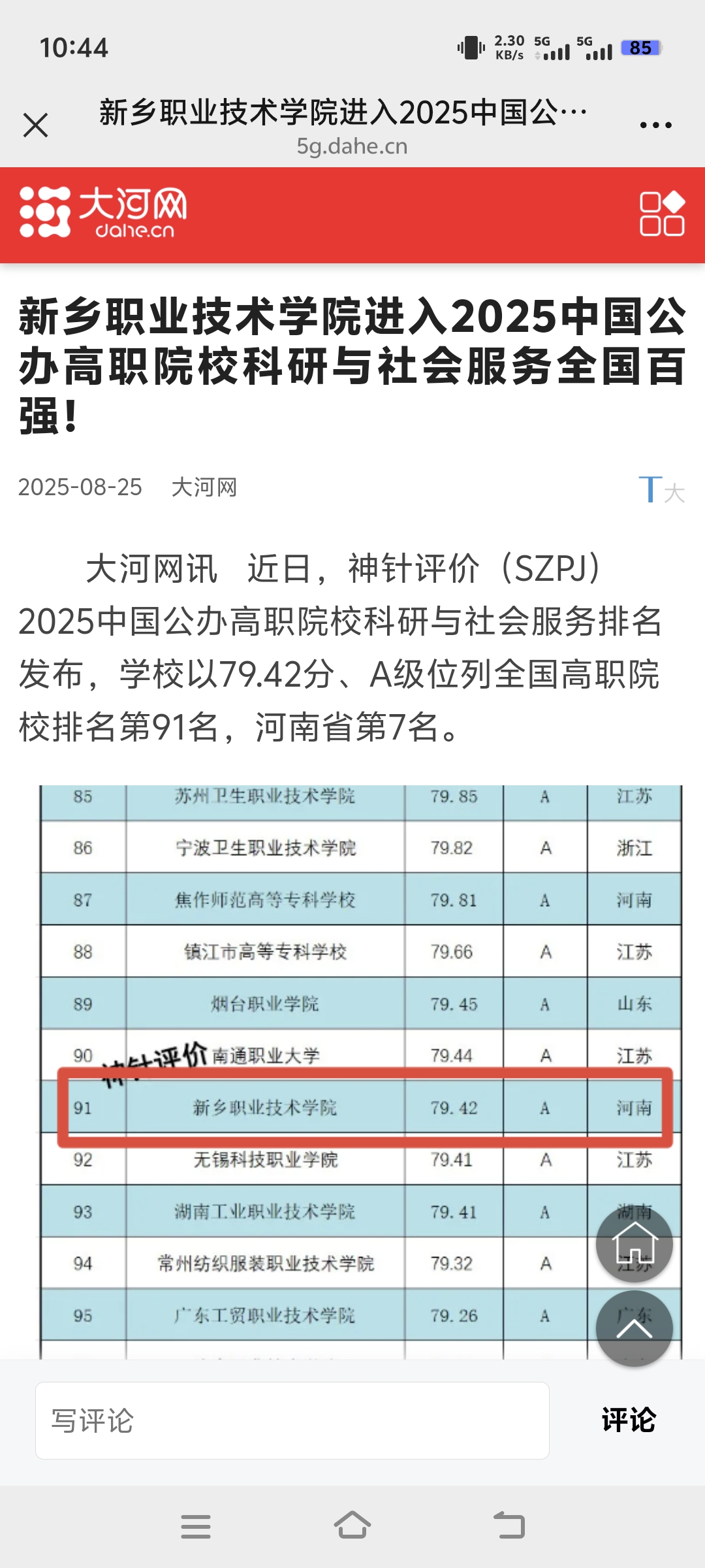 【大河网】新乡职业技术学院进入2025中国公办高职院校科研与社会服务全国百强!