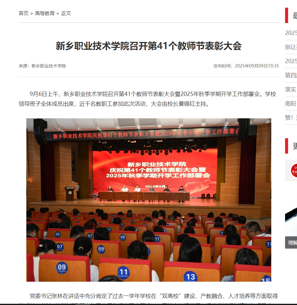 【河南教育宣传网】新乡职业技术学院召开第41个教师节表彰大会