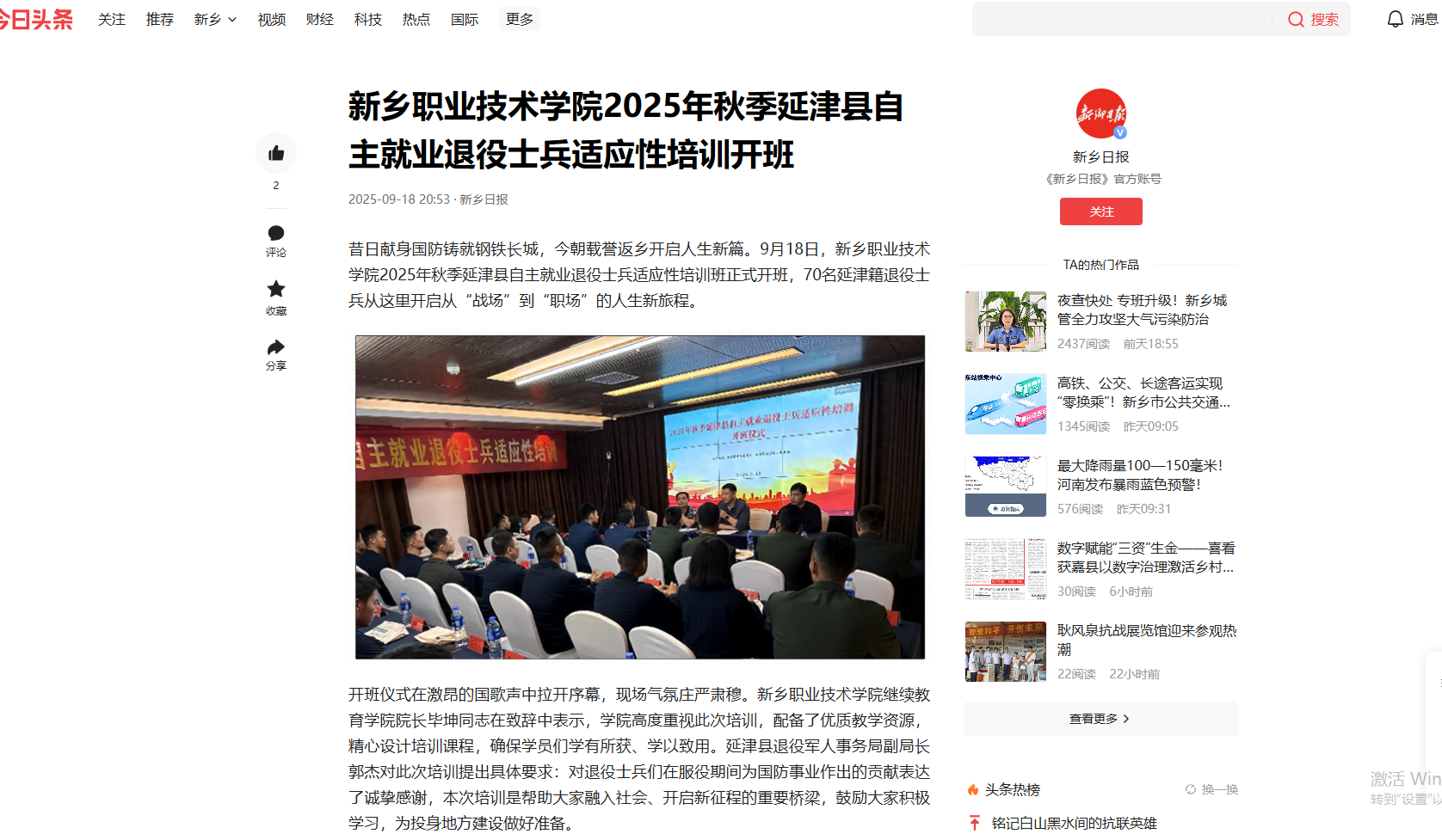 【今日新闻】新乡职业技术学院2025年秋季延津县自主就业退役士兵适应性培训开班