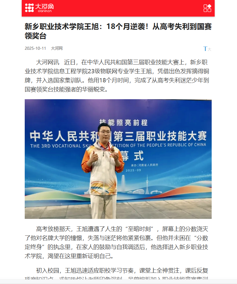 【大河网】新乡职业技术学院王旭:18个月逆袭!从高考失利到国赛领奖台
