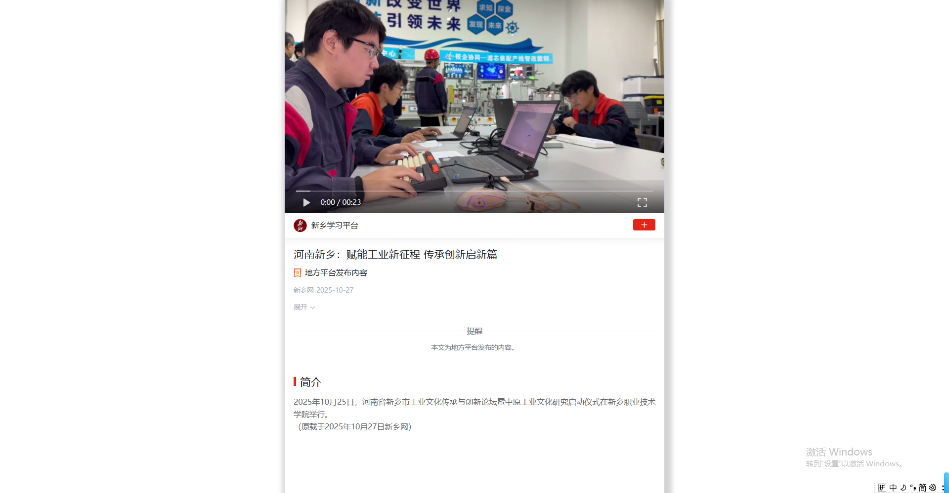 【学习强国】2025年10月25日,河南省新乡市工业文化传承与创新论坛暨中原工业文化研究启动仪式在新乡职业技术学院举行。