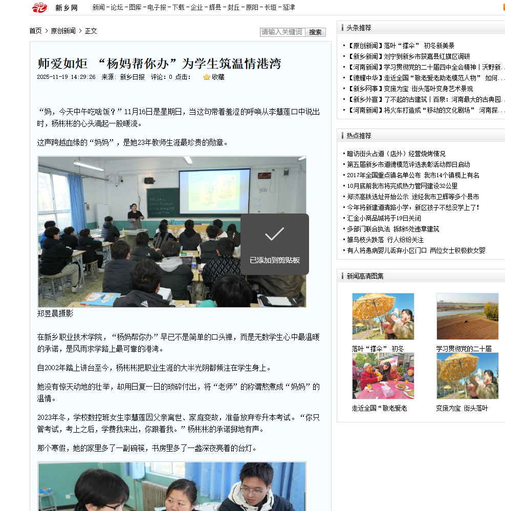 【新乡日报】师爱如炬 “杨妈帮你办”为学生筑温情港湾