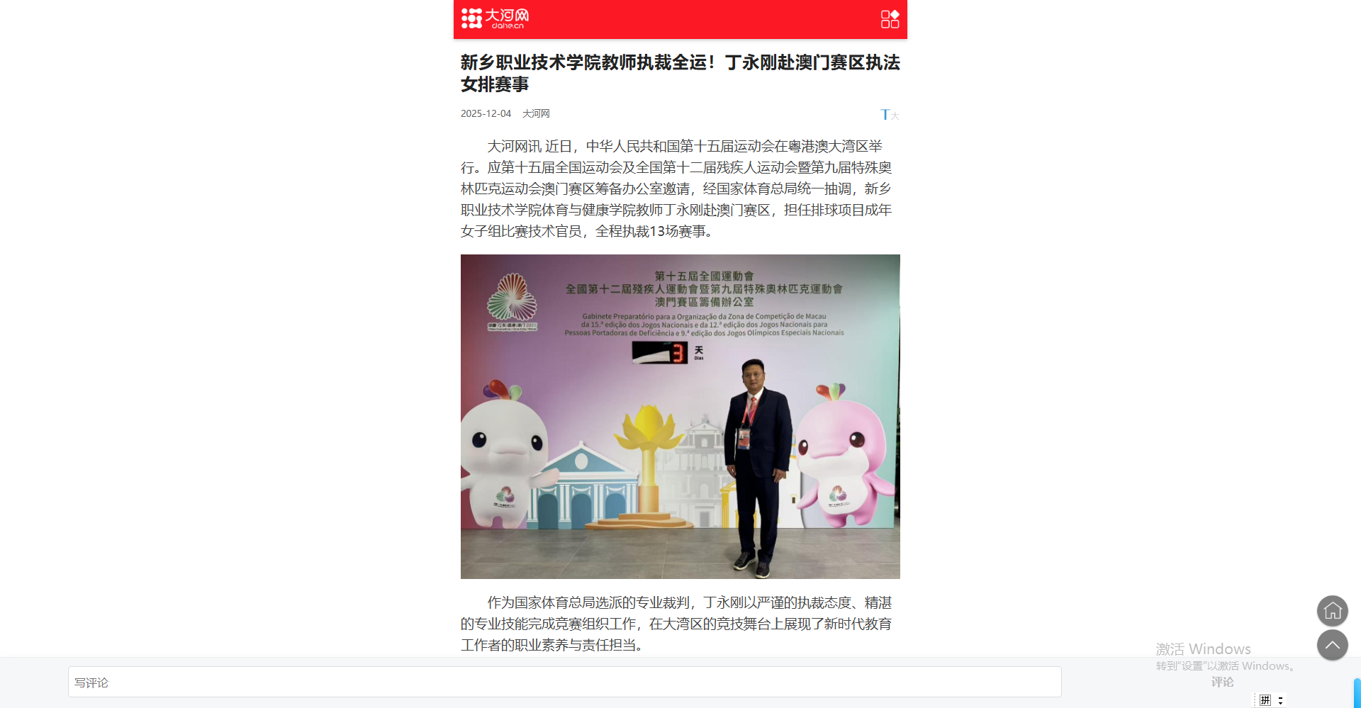 【大河网】新乡职业技术学院教师执裁全运!丁永刚赴澳门赛区执法女排赛事